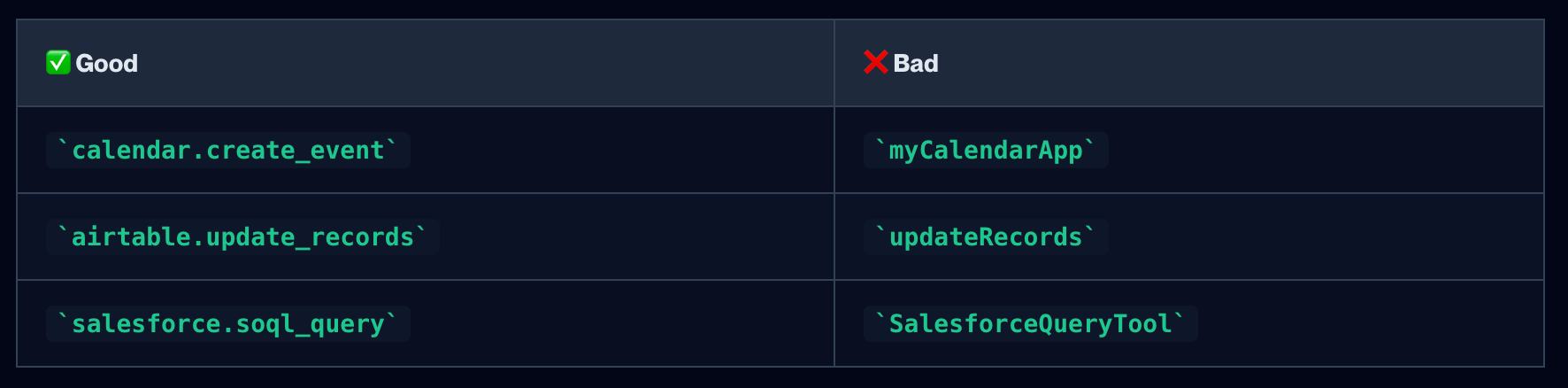 The format tells the LLM semantically what your tool does.