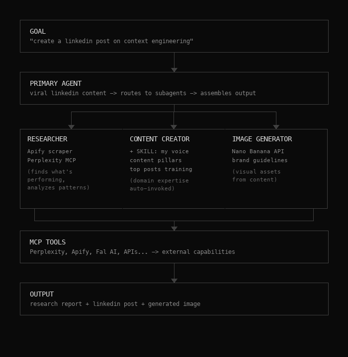 Subagent (Content Creator) → Skill (My LinkedIn Writing Style) → MCP Tools (Perplexity for research, Nano Banana for images)